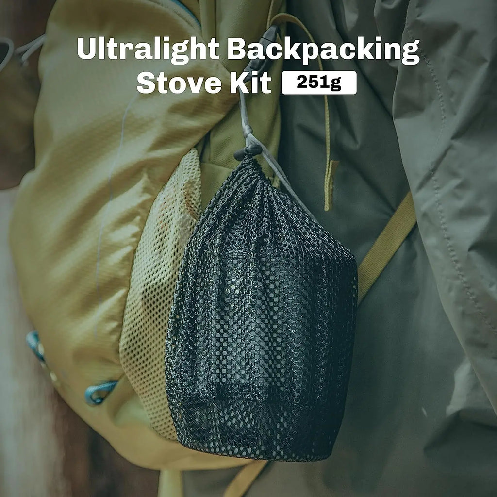 Ideal for: Solo adventures, ultralight backpacking, fast-and-light hunting expeditions System Weight: 210g total (161.6g pot + 48.5g stove + accessories) Pot Capacity: 600ml (20.3 oz) Gas Compatibility: G3-110g canister fits inside with stove