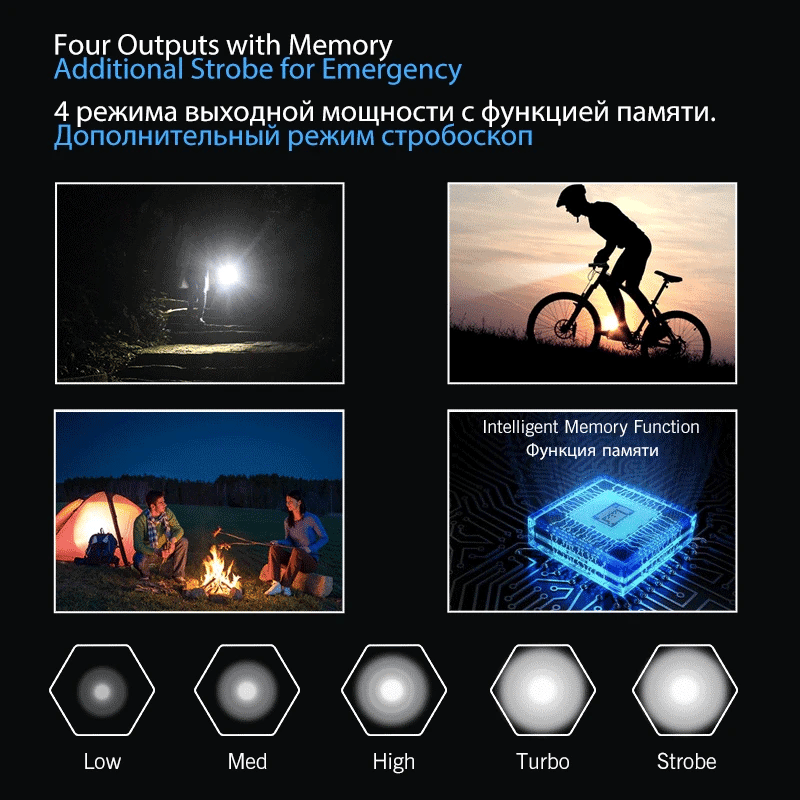 Modes: Low/Medium/High/Turbo/Strobe with memory