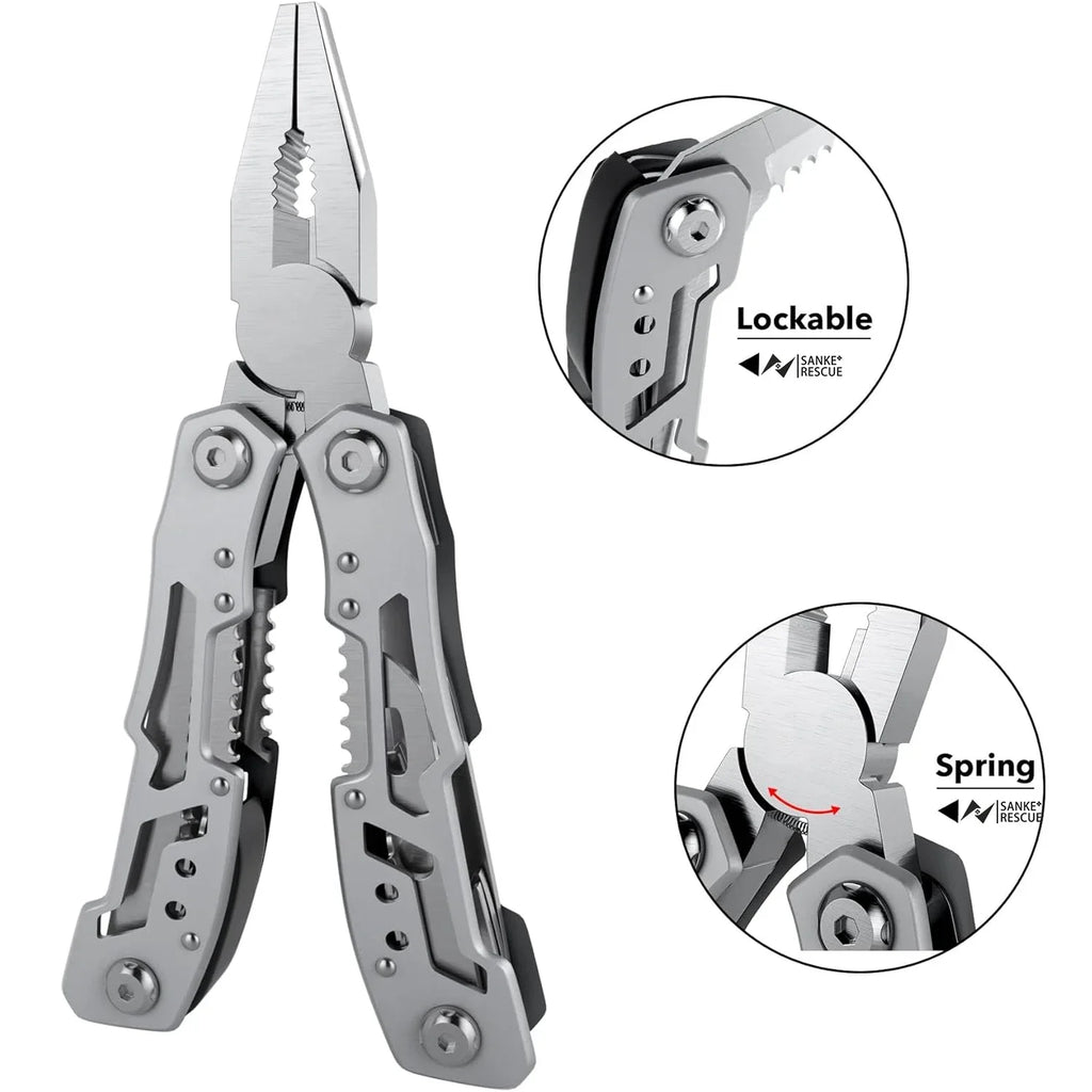 The SANKE RESCUE 14-in-1 multi-tool is designed for versatility and durability, making it an essential addition to your camping and survival gear. Crafted from high-quality stainless steel, it features a range of tools including knives, scissors, cutters, and manual pliers, all secured with a safety locking mechanism.